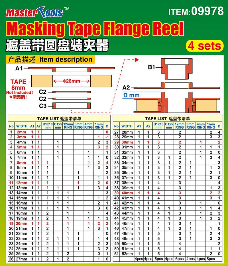 MASTER TOOLS MASKING TAPE FLANGE REEL 4 SETS